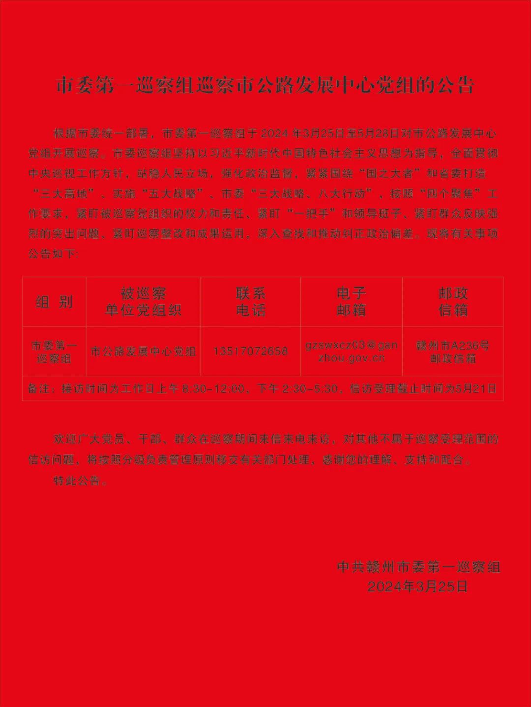 市委第一巡察組巡察市公路發(fā)展中心黨組的公告
