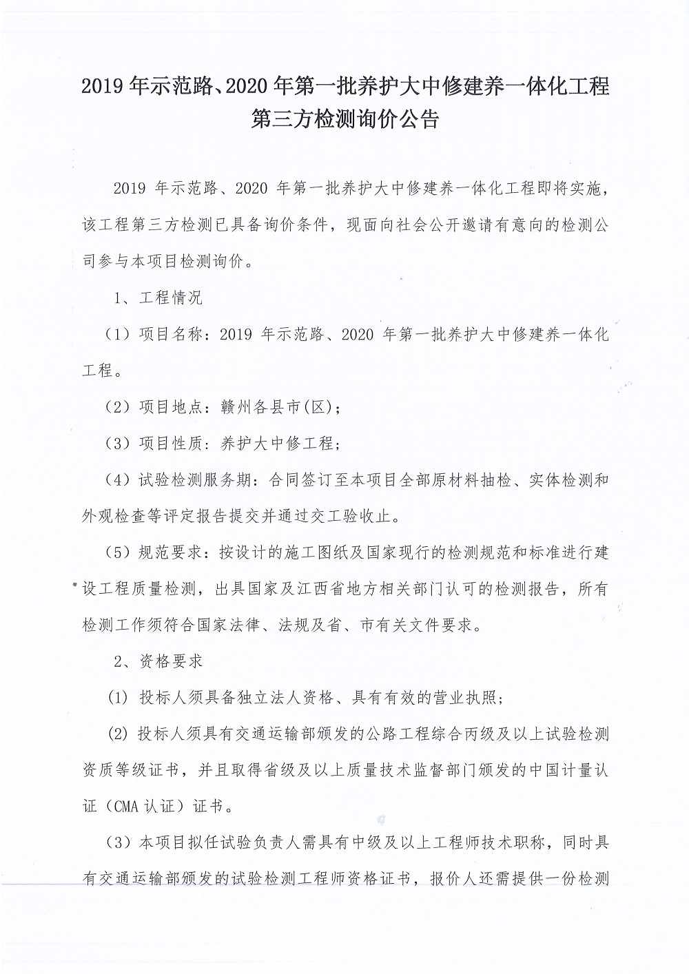 2019年示范路、2020年第一批養(yǎng)護(hù)大中修建養(yǎng)一體化工程第三方檢測詢價文件