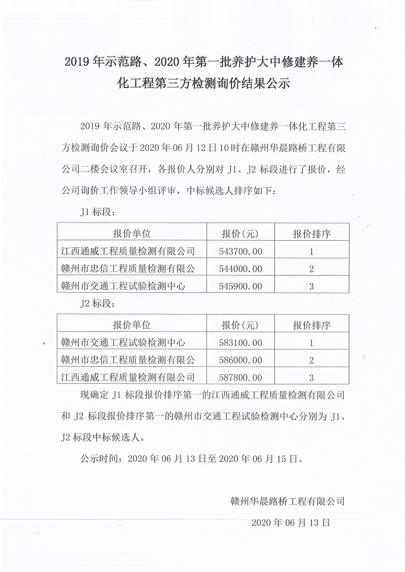 2019年示范路、2020年第一批養(yǎng)護大中修建養(yǎng)一體化工程第三方檢測詢價結(jié)果公示